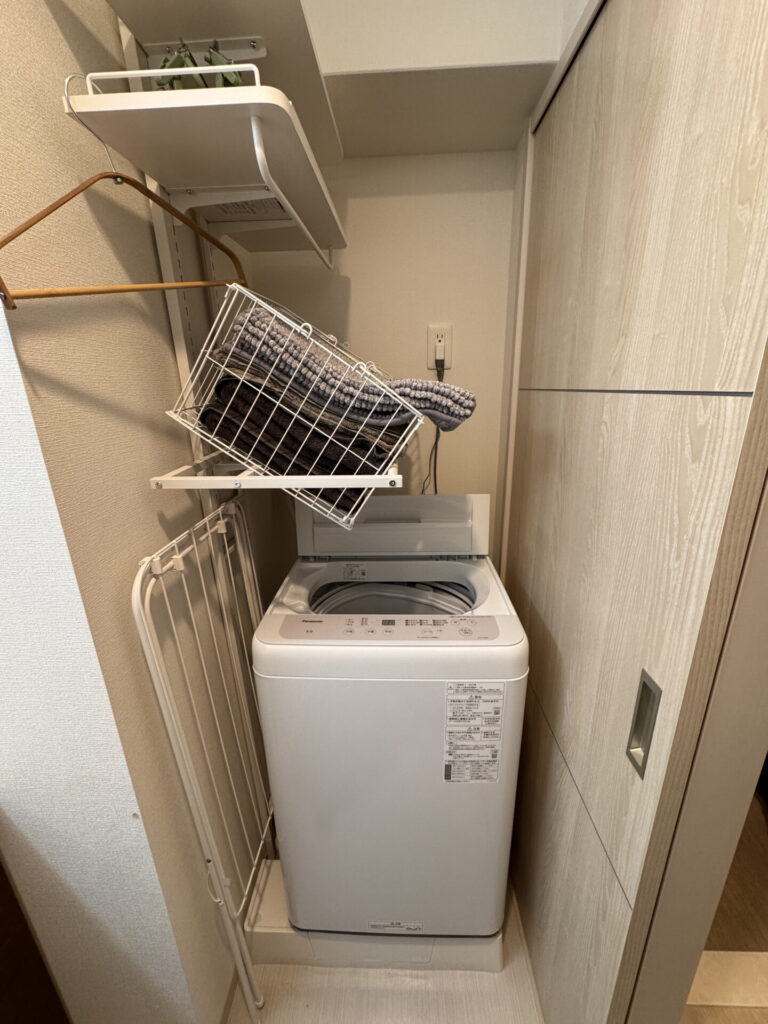 Washing machine, Dryer (located in the bathroom), Clothes drying rack, Laundry detergent